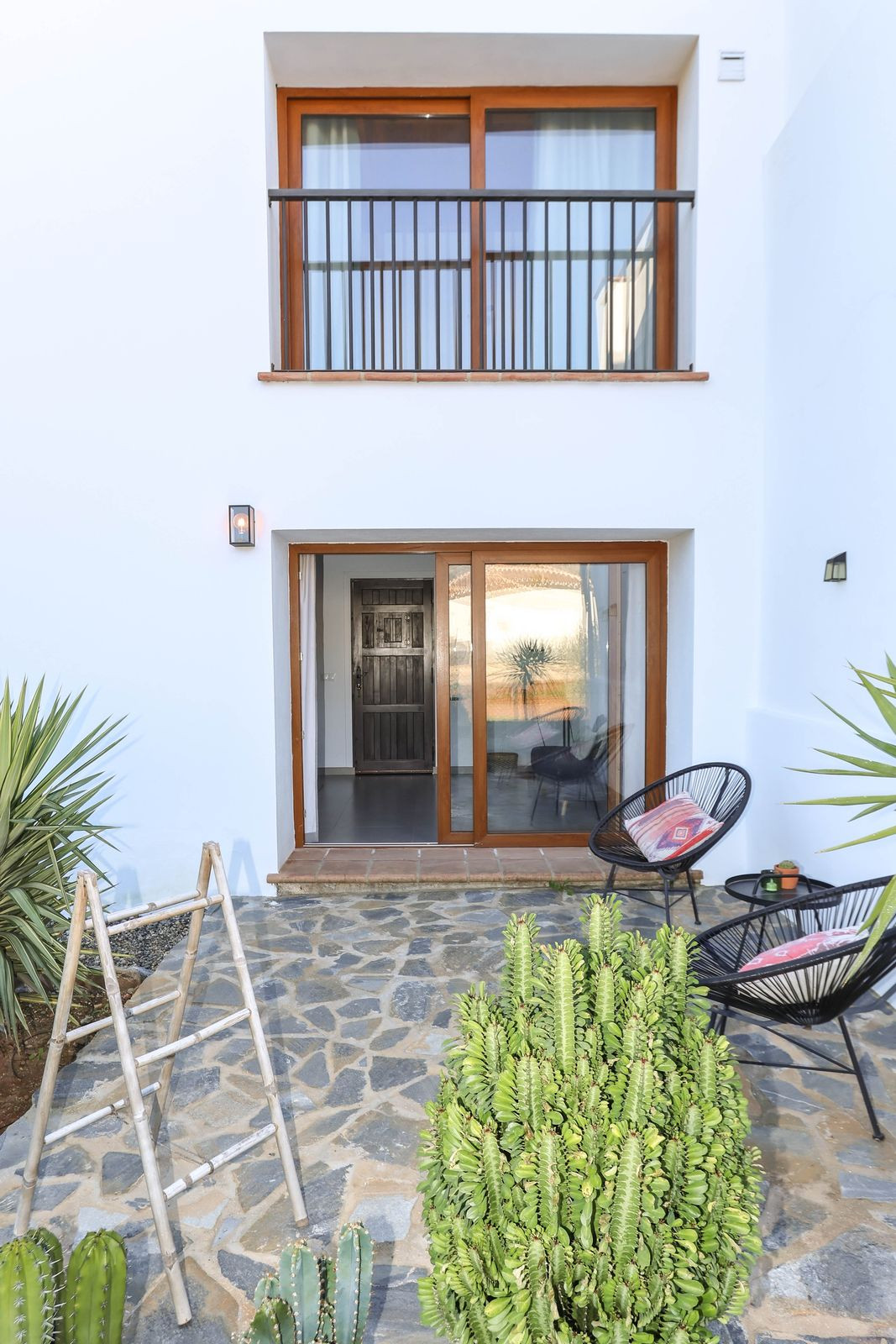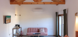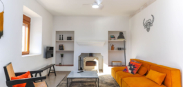 Bij binnenkomst in de hoofdaccommodatie word je meteen verrast door de prachtige hal met hoge plafonds met stucwerkelementen, de kleuren die de eigenaren hebben gekozen zijn warm en uitnodigend. De hal geeft toegang tot de zit/eetkamer die langs de achterkant van het huis loopt met directe toegang tot de binnenplaats. De keuken is ook toegankelijk vanuit de woonkamer. Er is ook een familiebadkamer. Twee van de slaapkamers liggen aan de voorkant van het pand, de derde ligt naast de woonkamer met uitzicht op de bergen aan de zijkant van het pand.