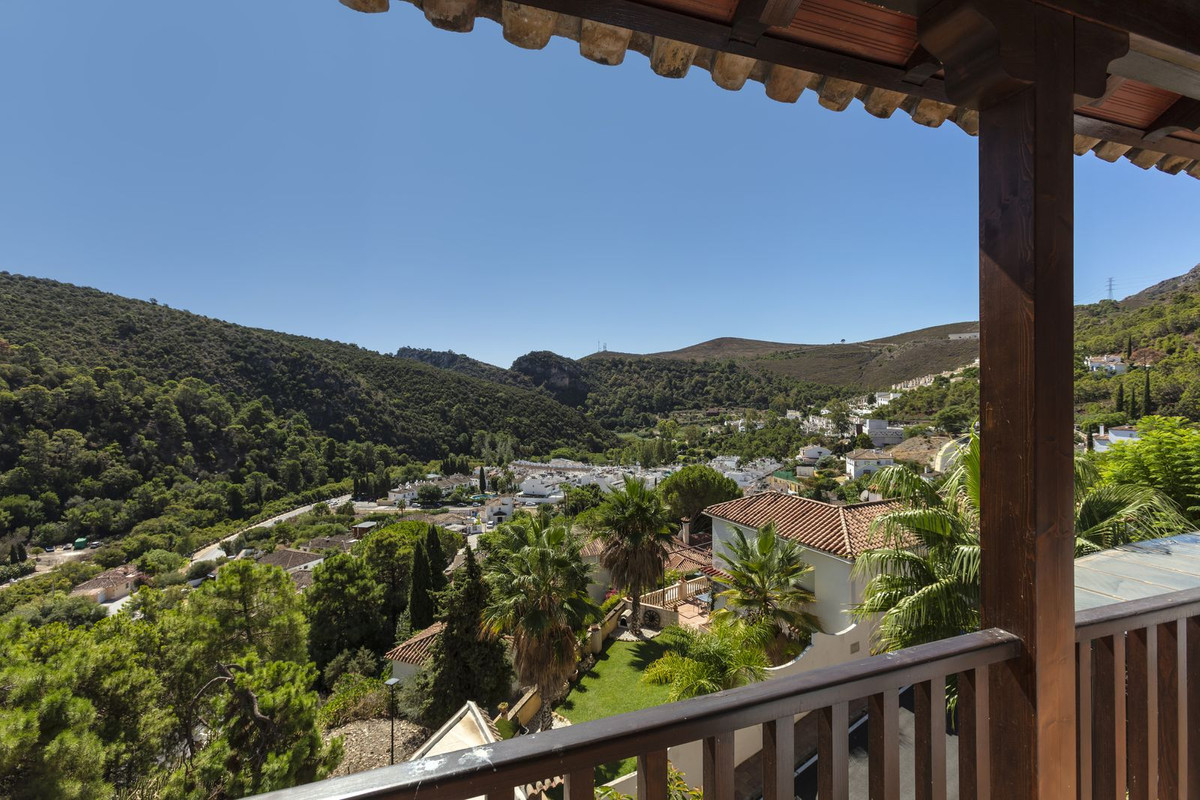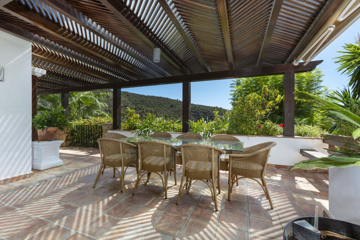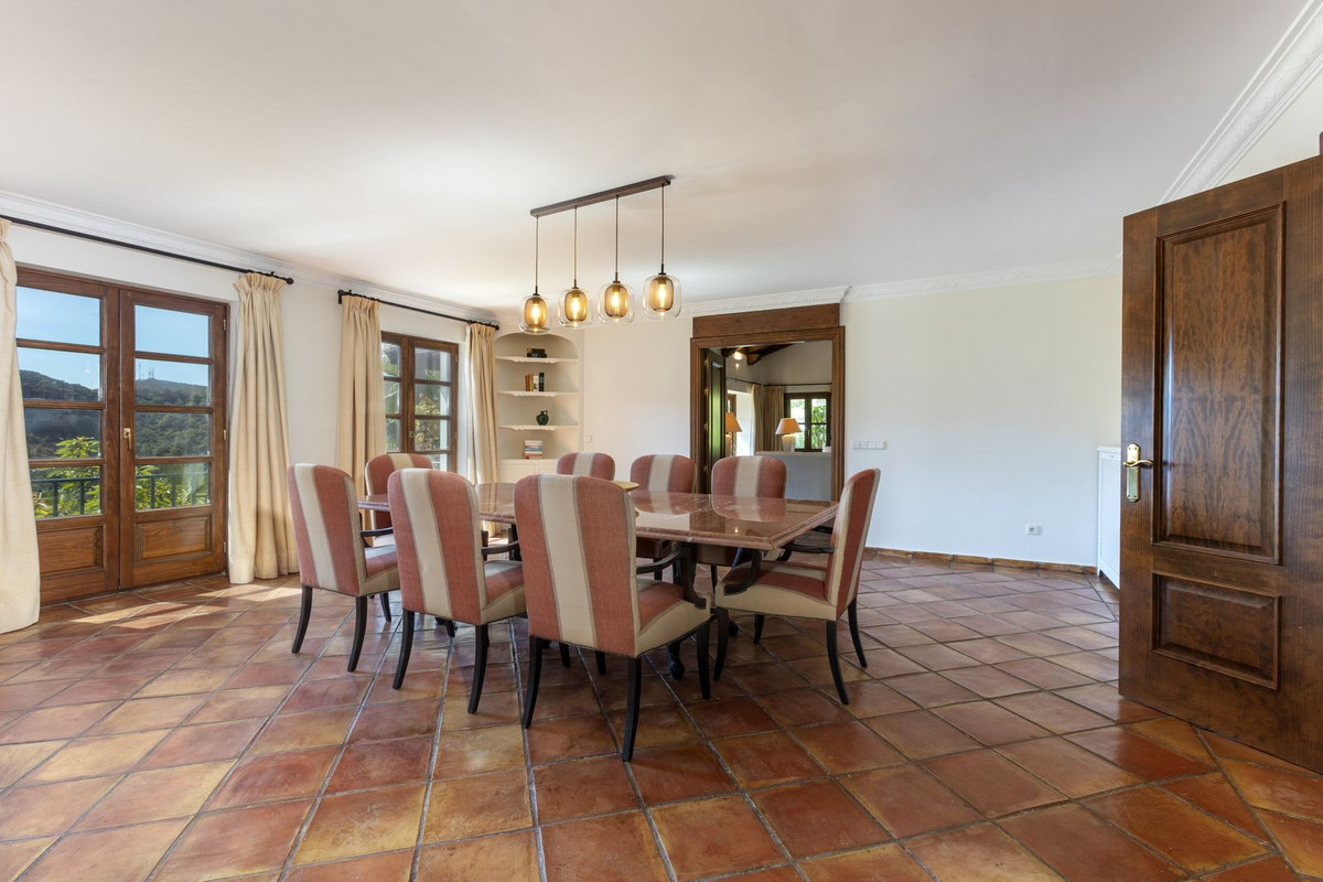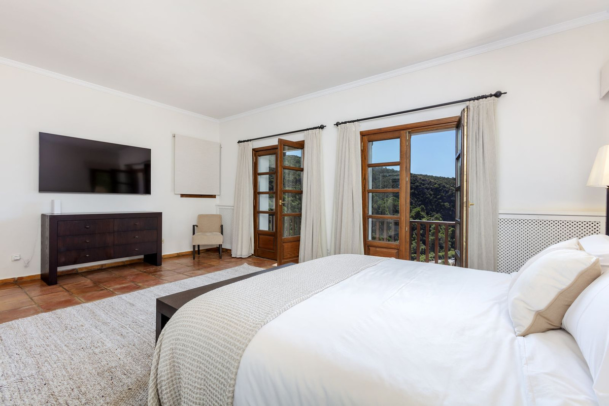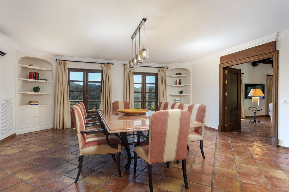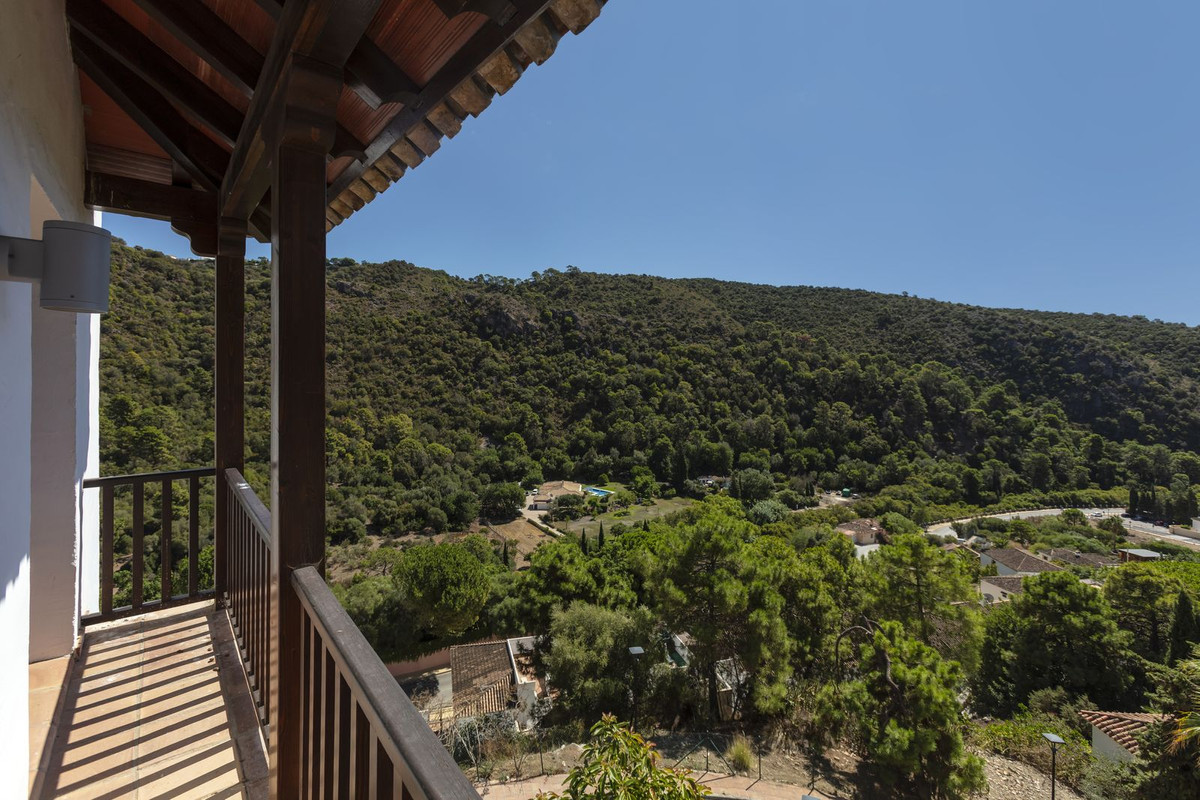 Elektrische poorten leiden je naar de oprit met parkeerruimte voor meerdere auto’s en een dubbele garage. Er is een bijkeuken plus grote keuken die uitkomt in de ontbijtkamer. Enorme eetkamer die uitkomt in de indrukwekkende zitkamer met hoge balkenplafonds en gezellige open haard – perfect voor winteravonden. Vanuit de zitkamer is er toegang tot een enorm terras en tuin met een groot verwarmd zwembad – ideaal voor alle zwemliefhebbers op een winterse dag! De tuin biedt totale privacy en een totaal panoramisch uitzicht over de vallei en het dorp en op de beschermde bosgebieden en het super exclusieve La Zagaleta.
