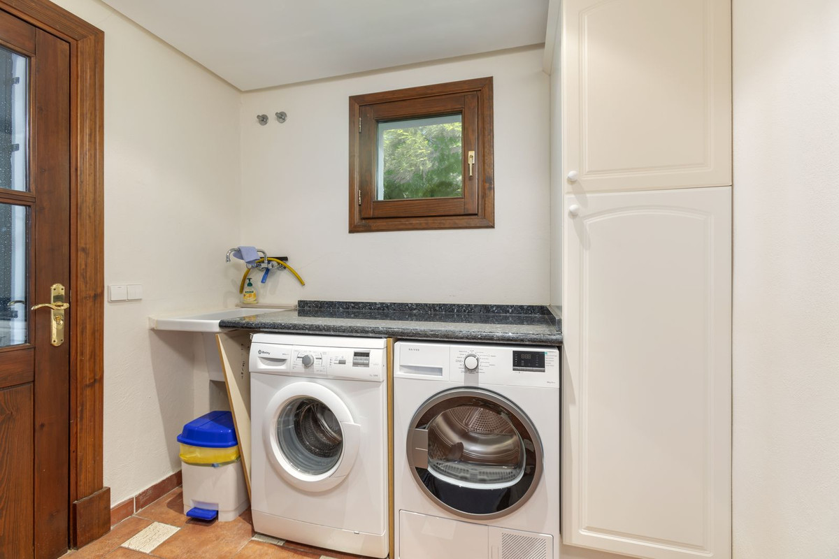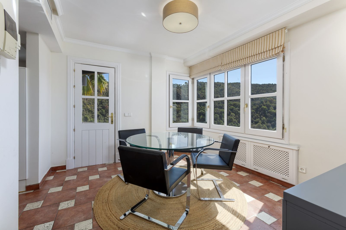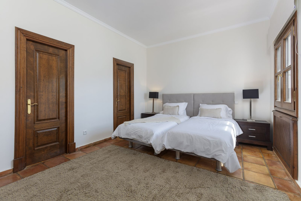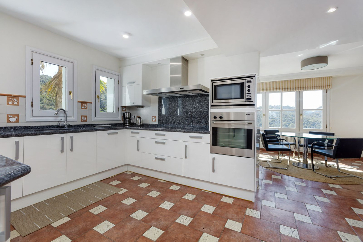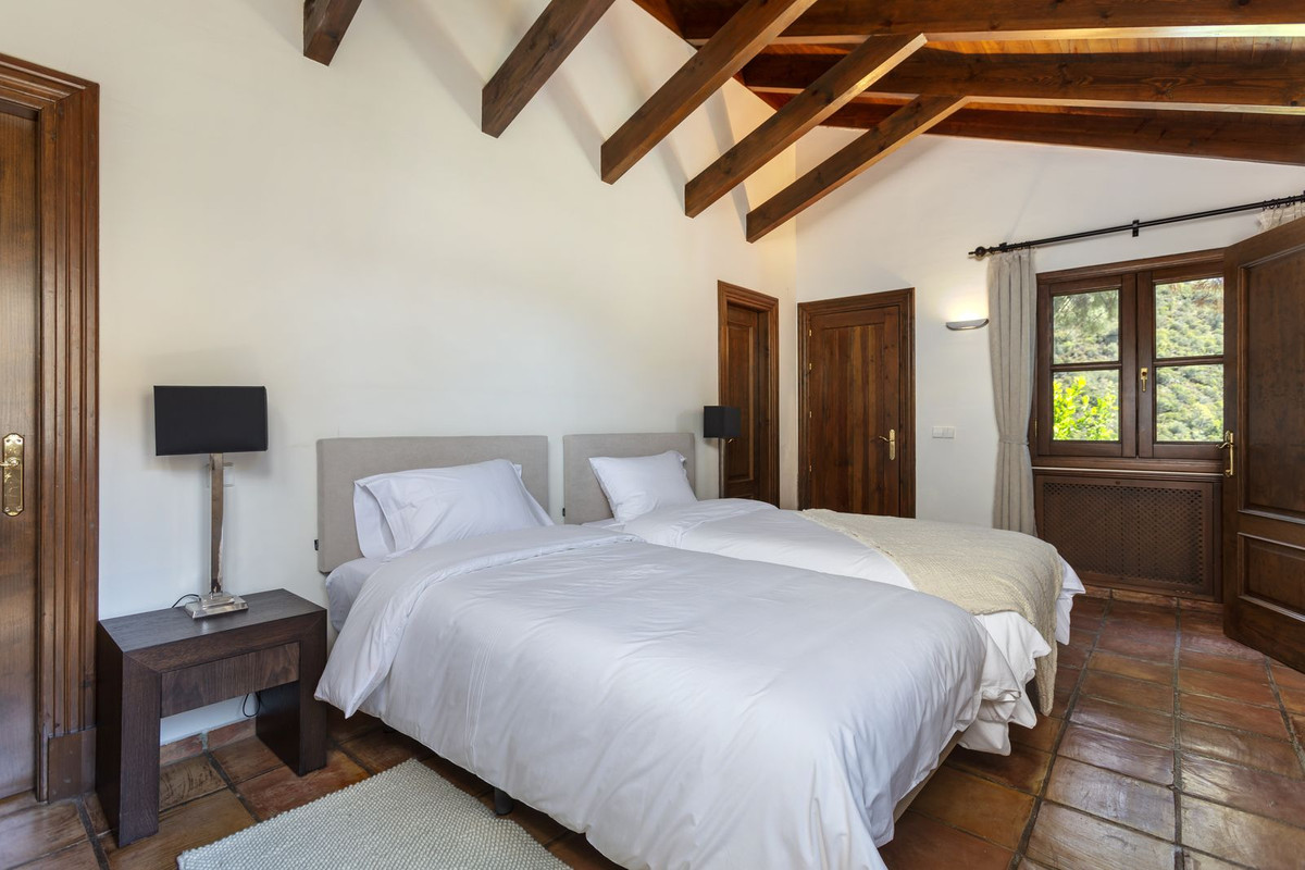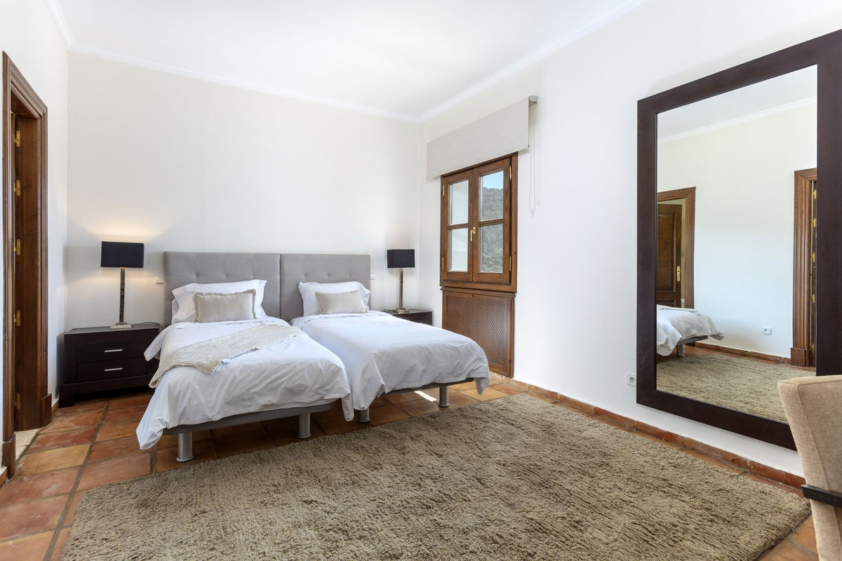 Elektrische poorten leiden je naar de oprit met parkeerruimte voor meerdere auto’s en een dubbele garage. Er is een bijkeuken plus grote keuken die uitkomt in de ontbijtkamer. Enorme eetkamer die uitkomt in de indrukwekkende zitkamer met hoge balkenplafonds en gezellige open haard – perfect voor winteravonden. Vanuit de zitkamer is er toegang tot een enorm terras en tuin met een groot verwarmd zwembad – ideaal voor alle zwemliefhebbers op een winterse dag! De tuin biedt totale privacy en een totaal panoramisch uitzicht over de vallei en het dorp en op de beschermde bosgebieden en het super exclusieve La Zagaleta.