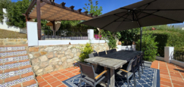ALS JE NAAR DE VILLA GAAT, KOM JE BIJ EEN GROOT OPEN TERRAS MET ZITHOEK, BUITENBANKEN EN EEN KOFFIETAFEL, MET PRACHTIG UITZICHT OP DE BERGEN EN HET PLATTELAND.
