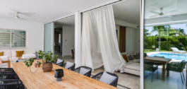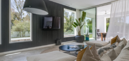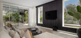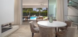 Er is een grote halfopen woonkamer met open haard en ramen van vloer tot plafond en natuurlijk licht vanuit bijna elk aspect. Er is een groot overdekt terras dat zowel in de zomer als in de winter gebruikt kan worden. De woonkamer, het hoofdterras en het zwembad liggen allemaal op hetzelfde niveau, zonder treden.