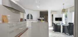 Verder biedt de villa een volledig ingerichte en uitgeruste open keuken met aparte bijkeuken, een dubbele garage (2) met extra buitenparkeerplaatsen (2) en een bodega voor opslag. De garage leidt direct naar de keuken.