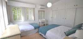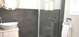 De villa heeft drie slaapkamers en twee badkamers. Een slaapkamer ligt naast de woonkamer, terwijl de andere twee bereikbaar zijn via een paar treden en een stijlvolle badkamer delen met een inloopdouche.