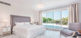 De hoofdslaapkamer heeft een eigen woonkamer en toegang tot een privéterras met uitzicht op de tuin en de golfbaan.