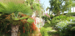 Buiten voegt een levendige subtropische tuin schoonheid toe en kan gemakkelijk worden onderhouden.