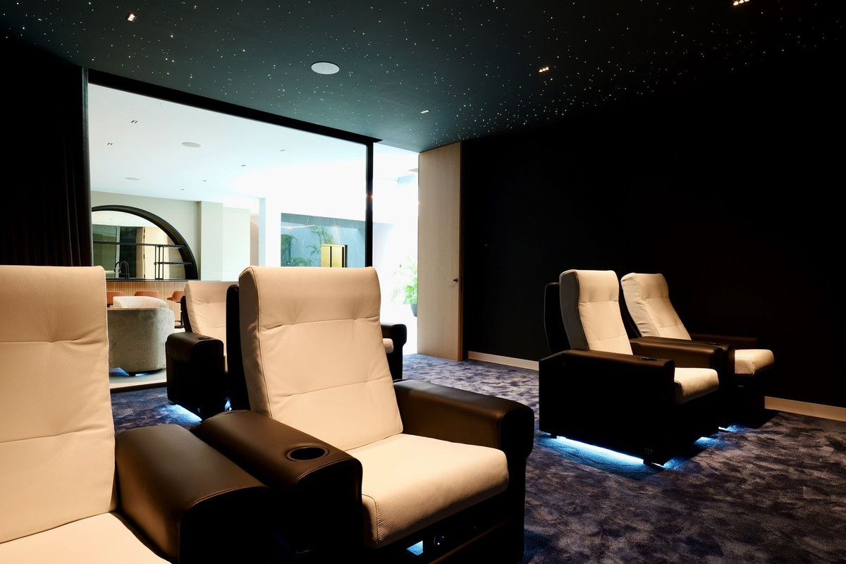 Boven genieten drie slaapkamers met privéterrassen van panoramisch uitzicht op zee en de bergen. De kelder herbergt een bioscoop, bar, multifunctionele ruimte, gastensuite, wasruimte, opslagruimte en een garage voor maximaal acht auto’s.