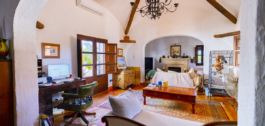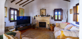 authentieke charme. Vanuit de hal lonkt een ruime woonkamer, versierd met een grote open haard die warmte en gezelligheid uitstraalt. De kamer baadt in het natuurlijke licht dat binnenvalt door de openslaande deuren die naadloos leiden naar het ruime overdekte terras en de binnenplaats. Dit buitenverblijf biedt een adembenemend uitzicht op de bergketen en nodigt je uit om te genieten van de pracht van het omringende landschap.