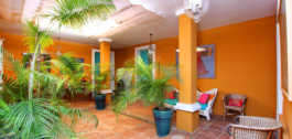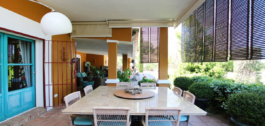 Een charmante patio van 200m2 met citroenbomen en een overdekte eethoek verwelkomen je in het huis.