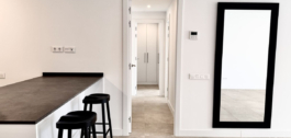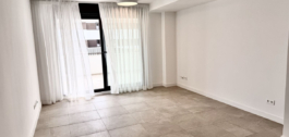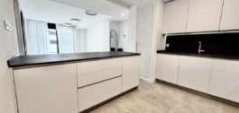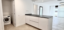 De open woonkamer met een moderne keuken komt uit op een ruim privéterras – perfect om te genieten van de mediterrane levensstijl.