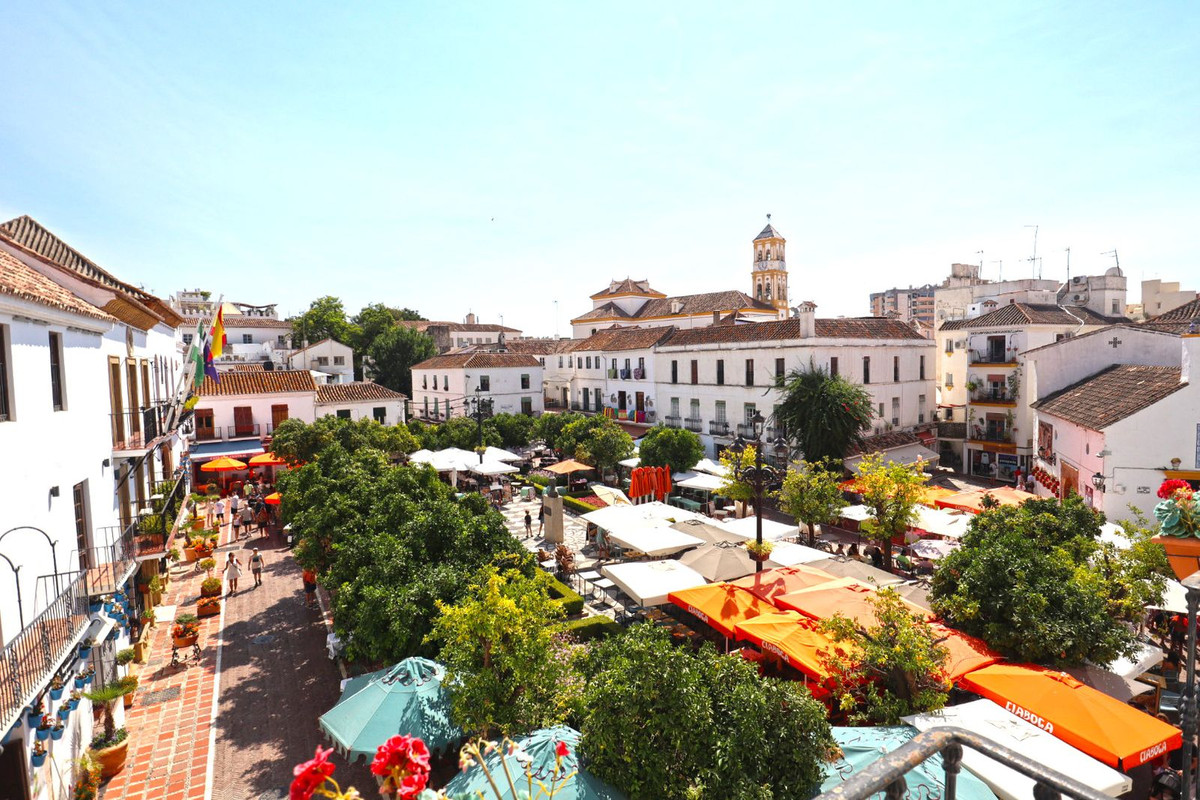 Unieke en onherhaalbare koopkans. Exclusief elegant gemeubileerd appartement te koop, gelegen in het historische centrum van Marbella en met prachtig uitzicht op het emblematische Plaza de Los Naranjos en de Hermitage van Santiago, de oudste van de stad. Het heeft zijn toegang via de drukke straat La Estación en zijn charmante winkels. Gevormd door de vereniging van 2 woningen op de tweede verdieping, heeft het al het karakter van een typisch huis in de oude stad en tegelijkertijd met veel details en luxueus ingericht. De woning bestaat uit een hal, een verdeler met inbouwkasten, een grote volledig ingerichte en uitgeruste keuken, een grote woonkamer met toegang tot 3 balkons met prachtig uitzicht op Plaza de Los Naranjos, 2 slaapkamers en 2 badkamers, een van hen op suite kamer. 10 m2 magazijn inbegrepen in de prijs. Warme en koude airconditioning in alle kamers. Een waar juweeltje voor liefhebbers van het oude centrum van Marbella en zijn hoekjes.