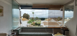 De woon/eetkamer is opvallend licht dankzij de grote ramen die uitkomen op een ruim terras omsloten door glazen gordijnen, vanwaar je kunt genieten van het uitzicht op de golfbaan en de woonwijk.