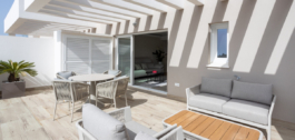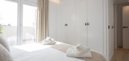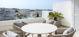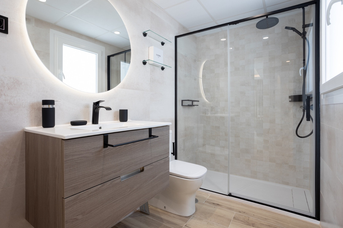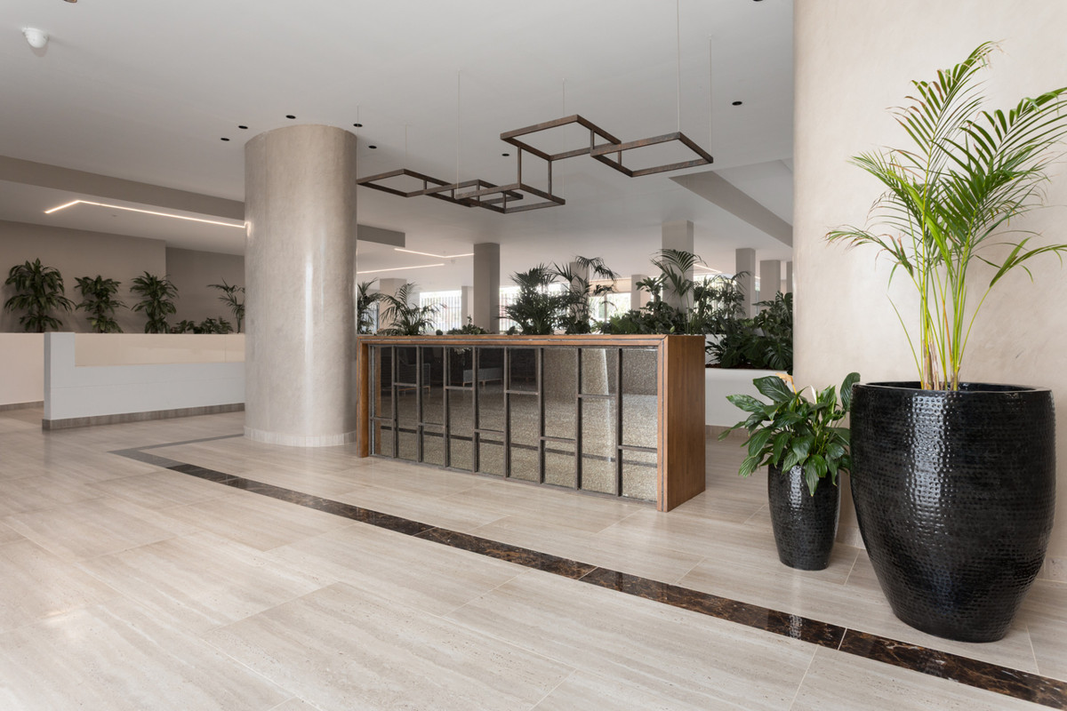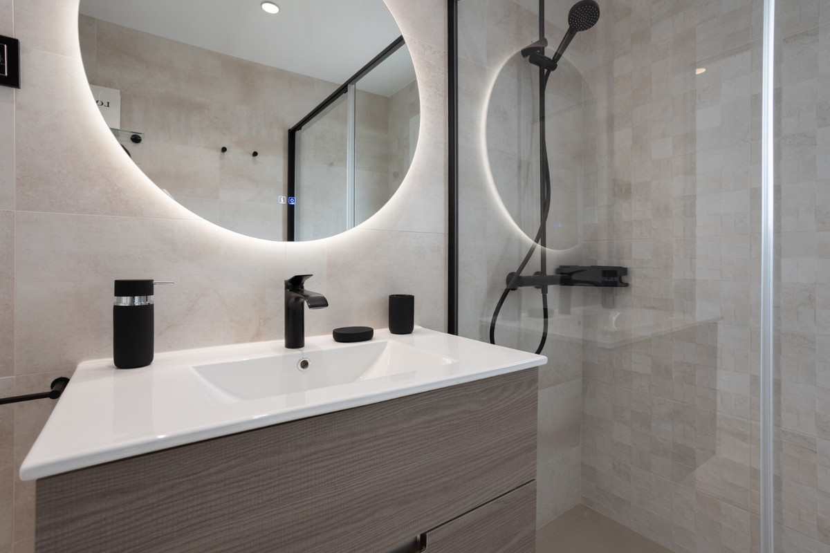 Schoon en modern meubilair vullen de minimalistische lijnen en het neutrale palet van het appartement aan, waardoor een serene omgeving ontstaat die moeiteloos stijlvol aanvoelt. Het uitgestrekte terras, toegankelijk vanuit de woonkamer en beide slaapkamers, biedt een idyllische ruimte om te loungen in de zon, te genieten van al fresco maaltijden, of te genieten van de rustige sfeer van deze goed gelegen woonenclave. Het gevoel van openheid zet zich voort in de slaapkamers, die beide royaal bemeten zijn en voorzien van ingebouwde kasten. De master suite biedt een extra vleugje luxe met een eigen ensuite badkamer met een inloopdouche, terwijl de tweede badkamer gunstig is gelegen om zowel gasten als de tweede slaapkamer met evenveel comfort te bedienen.