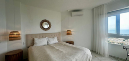De lichte woonkamer komt uit op een ruim terras, perfect om te ontspannen of buiten te eten terwijl je de horizon bewondert. De drie slaapkamers hebben ook uitzicht op zee en zorgen voor een rustige en heldere sfeer.