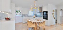 De lichte open woon- en eetruimte sluit naadloos aan op de moderne, volledig ingerichte keuken en komt direct uit op het terras – ideaal voor een ontspannen mediterraan leven en uitzicht op de zonsondergang.