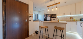 Met gepolijste marmeren vloeren, een moderne keuken, en een gezellige open haard, de open woon-en eetkamer sluit soepel aan op een groot, overdekt terras – gemaakt voor gemakkelijk binnen-buiten leven