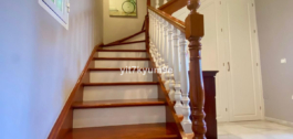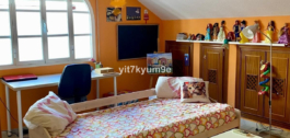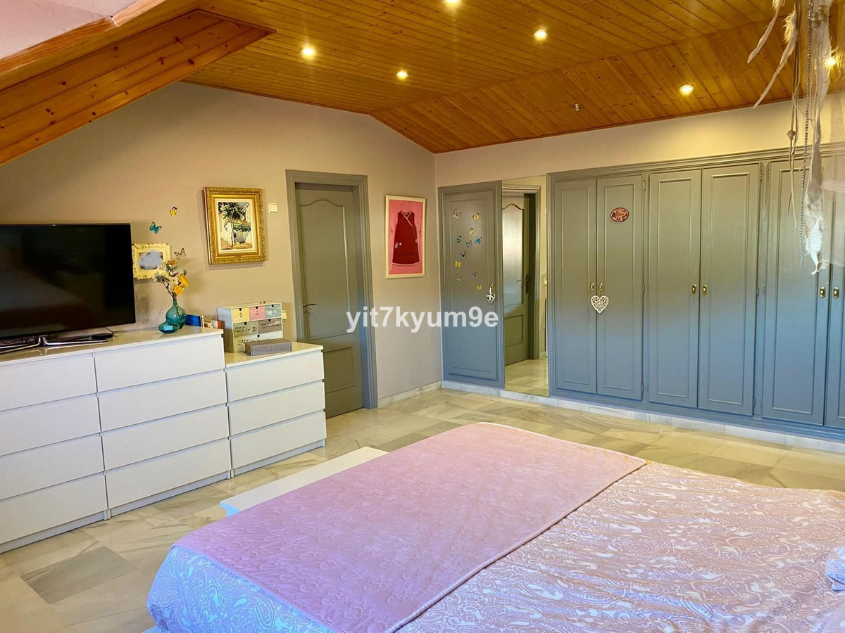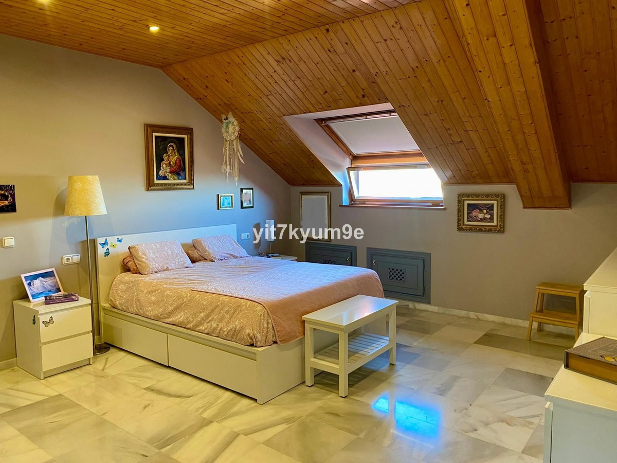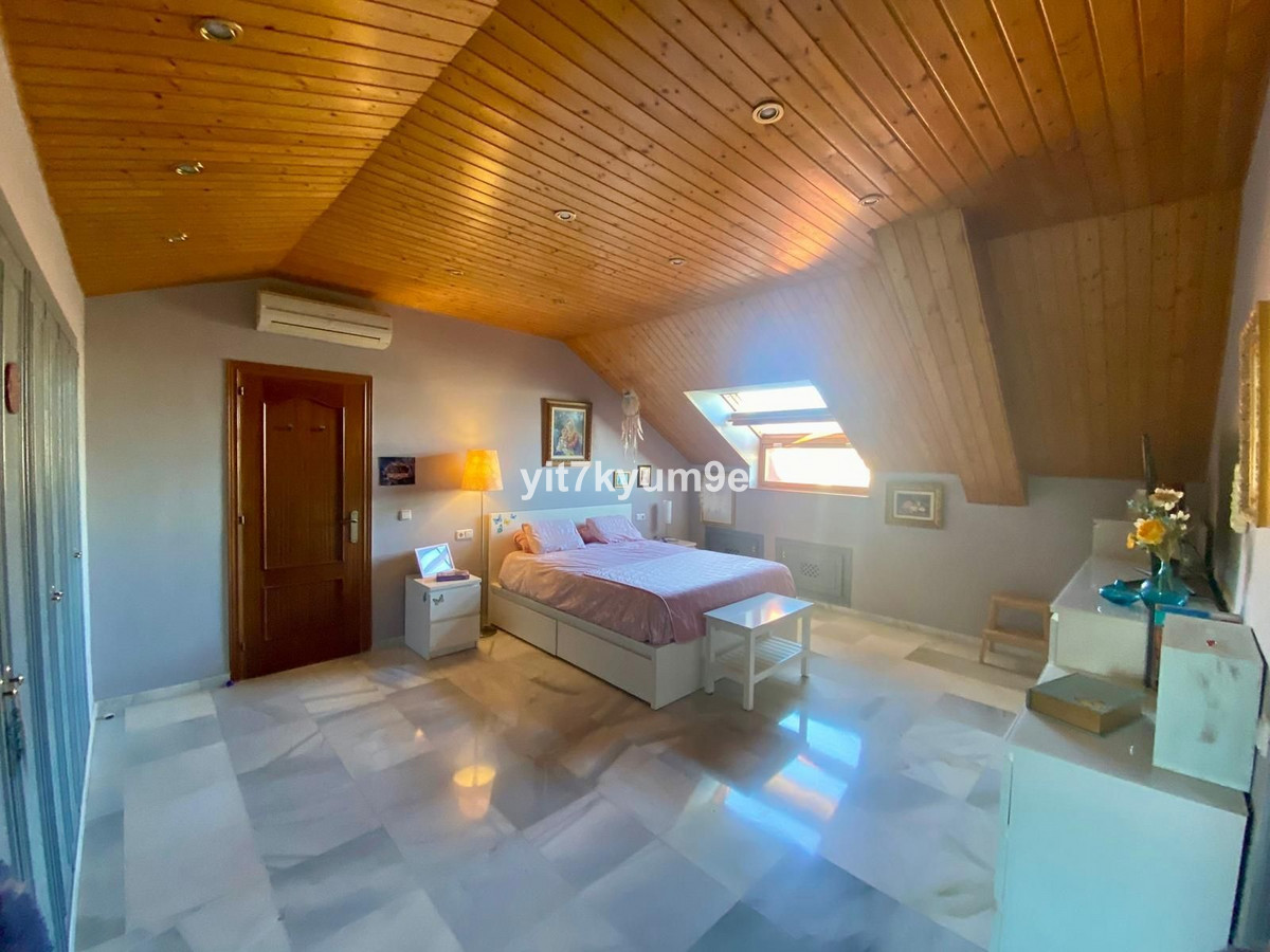 Verdeeld over twee verdiepingen, herbergt de begane grond de woonkamer, keuken, patio, wasruimte en een toilet, en de bovenverdieping heeft 4 zolderslaapkamers en 2 badkamers.