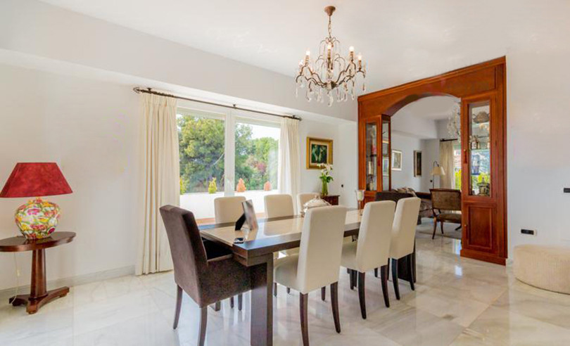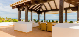 Het hoofdterras op het zuiden heeft een eetkamer onder een prachtige pergola in koloniale stijl en biedt magisch uitzicht op de Middellandse Zee en de hele baai van Malaga.