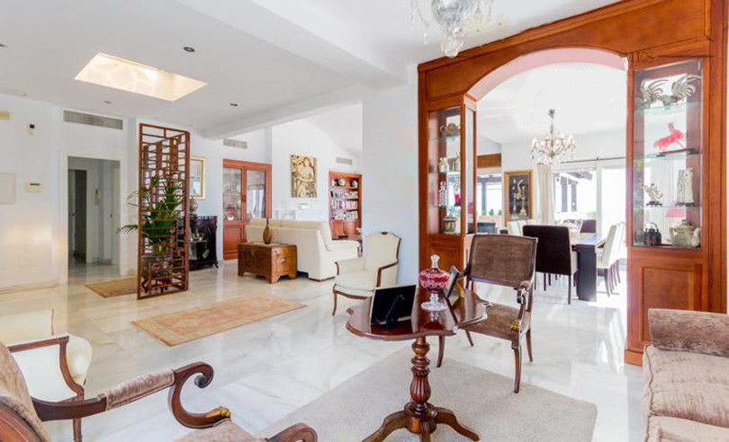 De woning is toegankelijk via een eigen, zeer veilige en discrete lift. Bij binnenkomst vinden we een majestueuze en zeer ruime woonkamer met hoge plafonds en met verschillende terrassen eromheen. Eetkamer, open haard, houten balken, is zeer elegant en gezellig tegelijk.