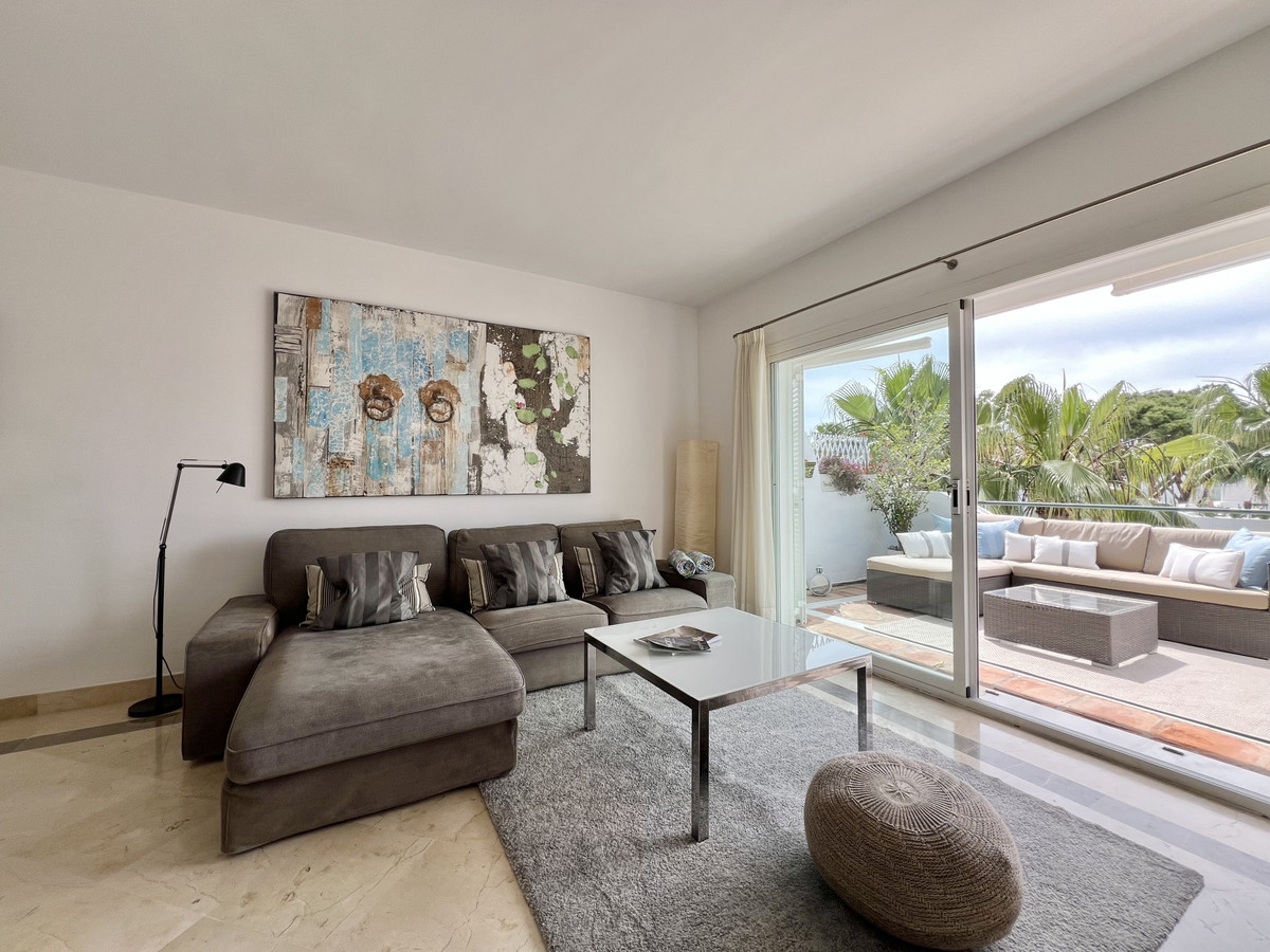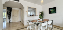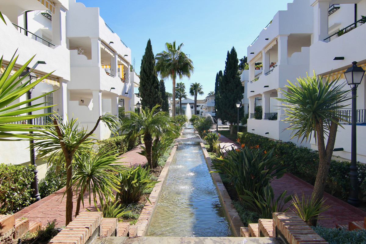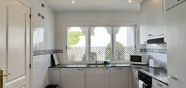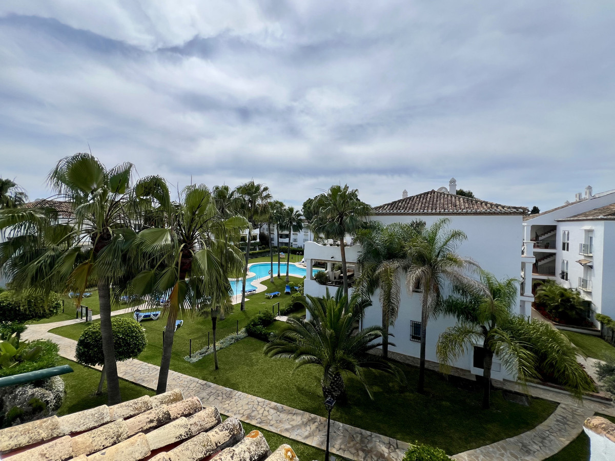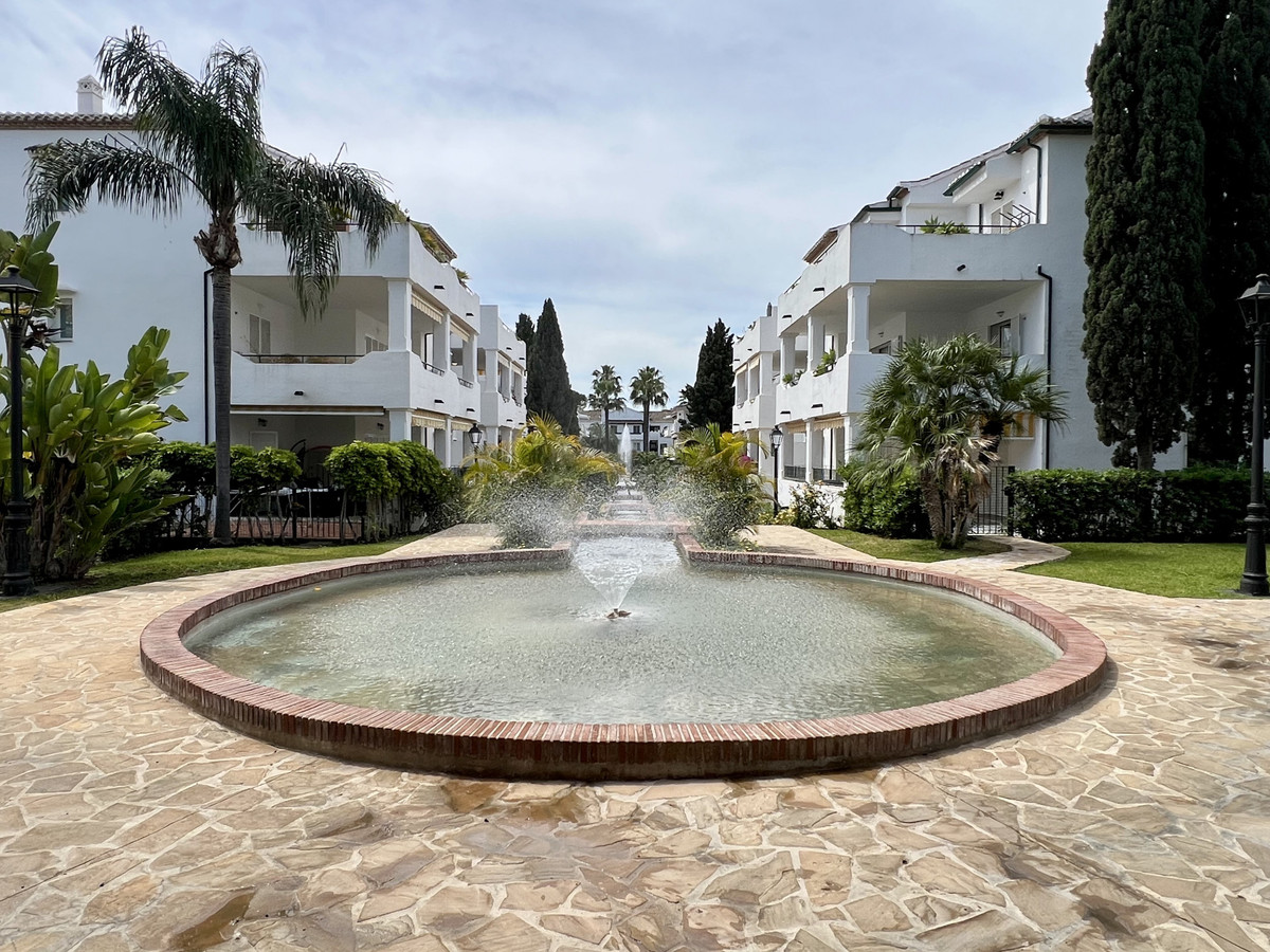 Fantastisch appartement op de bovenste verdieping, op het zuiden, in El Presidente. De prachtige entree, vol met aromatische planten, verwelkomt ons, en zodra we de hal binnenkomen, waarderen we hoe het hele appartement baadt in het zonlicht. De ruime woon- en eetkamer, met grote glazen schuifdeuren, komt uit op het zeer zonnige terras. De hoofdslaapkamer heeft ook direct toegang tot hetzelfde terras en beschikt over een en-suite badkamer. De tweede slaapkamer kijkt uit op een charmant dennenbos. De tweede badkamer dient ook als gastentoilet. De keuken is volledig uitgerust. El Presidente biedt een grote parkeerplaats, vijf zwembaden, waarvan er een het hele jaar door verwarmd is, prachtige volgroeide gemeenschappelijke tuinen met fonteinen, tennis- en paddlebanen en 24-uurs beveiliging. Voorzieningen, supermarkten en restaurants liggen op loopafstand, evenals het strand, het nieuwe kustpad van Estepona en uitstekende restaurants zoals Salduna, op slechts 250 meter van het complex. Mis de kans niet om deze geweldige kans te bezoeken!