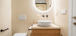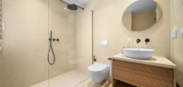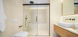 Elegante badkamers – Verwarmde vloeren, Fantini armaturen, Villeroy & Boch sanitair, glazen douches zonder frame en luxe eiken kasten.