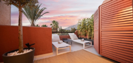 Lifestyle buiten – Drie privéterrassen met BBQ, zonneschermen, plafondventilatoren, aangelegde planten en panoramisch uitzicht op La Concha.