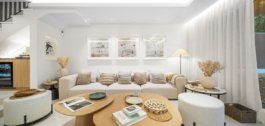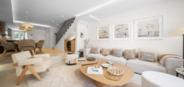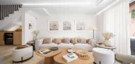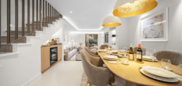 Het herenhuis strekt zich uit over vier verdiepingen en omvat meer dan 283m² bebouwde ruimte (225m² interieur), en beschikt over drie ruime slaapkamers en drie moderne badkamers, waaronder een luxe en-suite. De open keuken en woonkamer zijn ingericht met zorgvuldig uitgekozen meubels en natuurlijke texturen, waardoor een uitnodigende sfeer ontstaat die moeiteloos overloopt in een