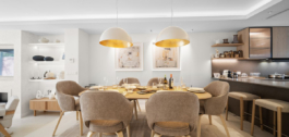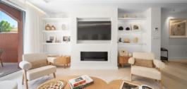 Designer woonruimtes – Open interieurs ingericht met zorgvuldig uitgekozen stukken, een opvallende open haard en verlichting op maat.