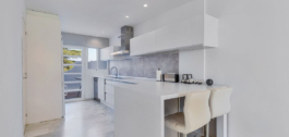 Begane grond: moderne volledig ingerichte keuken open naar de woon-eetkamer, met toegang tot een overdekt terras en de gemeenschappelijke tuin, plus een gastentoilet.