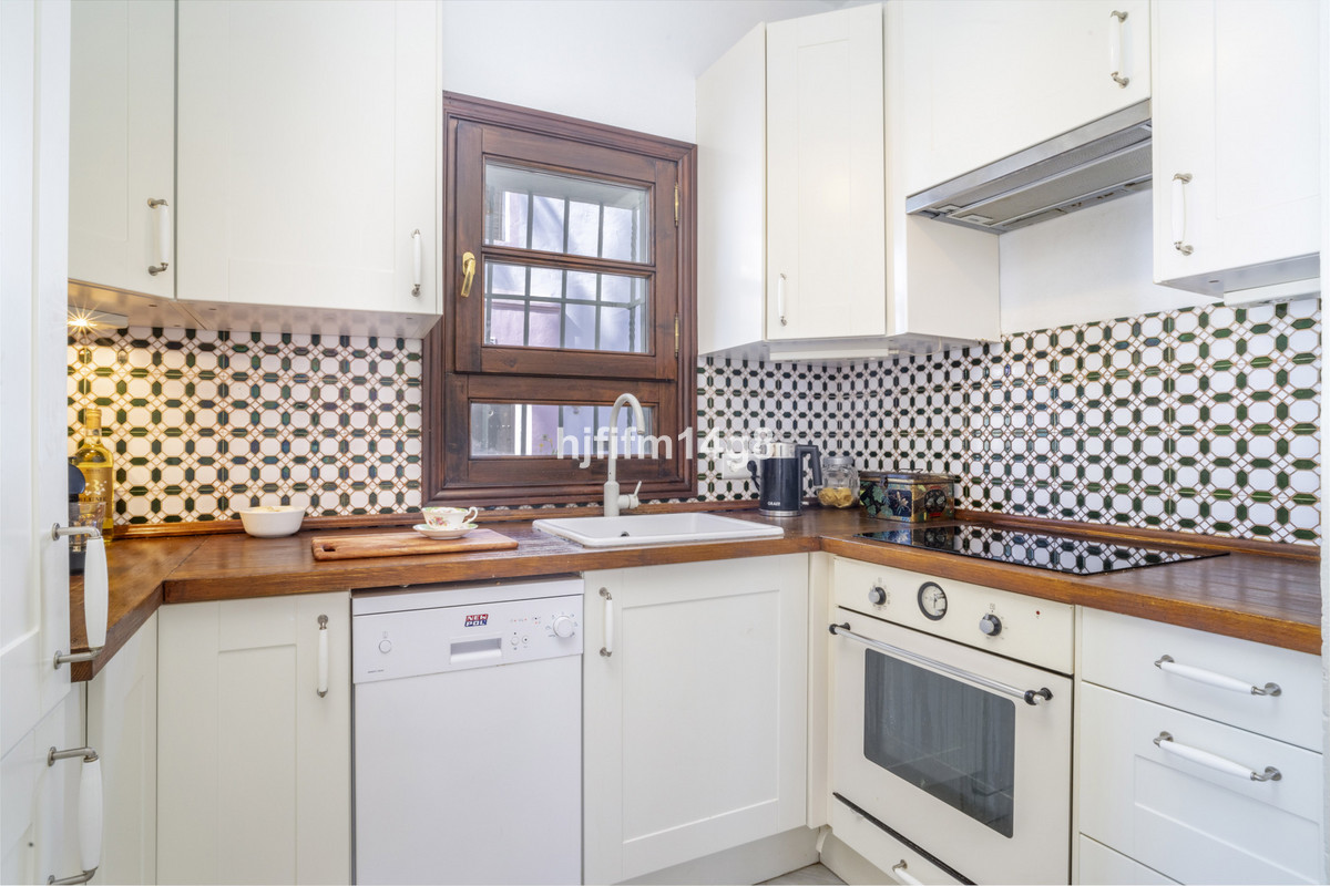 Stap binnen op de middelste verdieping, waar je een charmante woonkamer vindt met twee grote schuifdeuren – een naar het terras en de andere functioneert als een Frans balkon, die beide een prachtig uitzicht omlijsten en de ruimte overspoelen met natuurlijk licht. De compacte maar goed ontworpen keuken ligt net naast de woonkamer – praktisch en efficiënt voor dagelijks gebruik of vakantieverblijf.