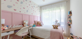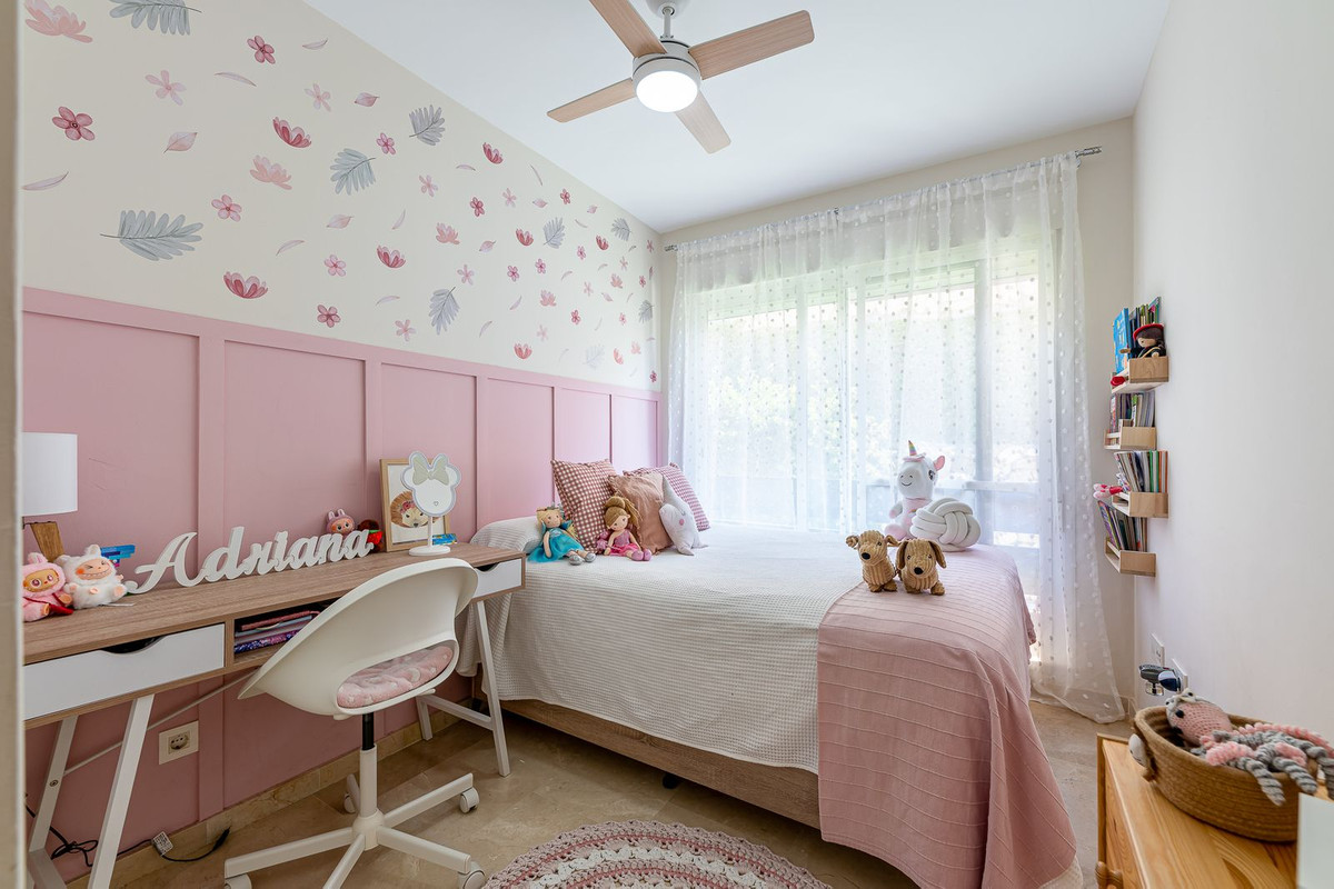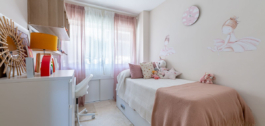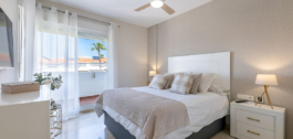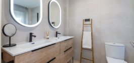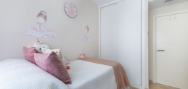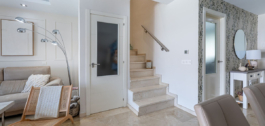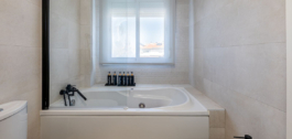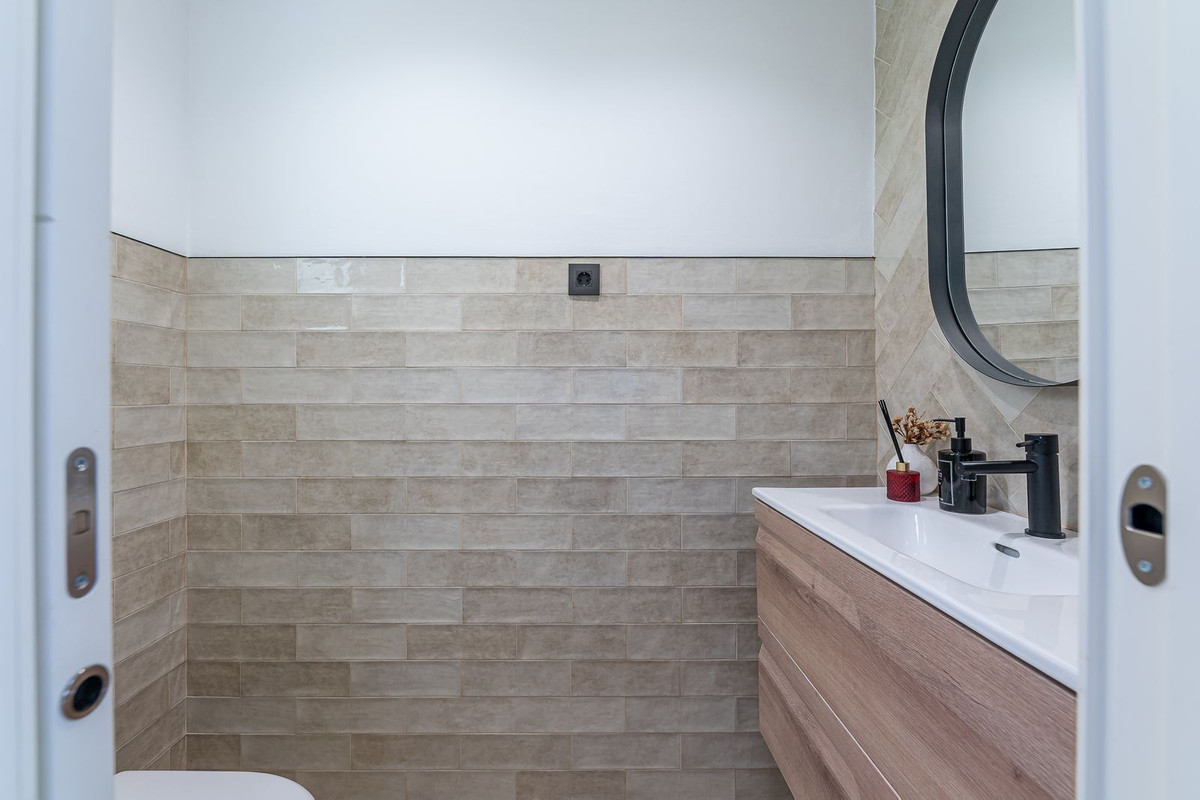 De bovenste verdieping heeft drie tweepersoonsslaapkamers, waaronder de hoofdslaapkamer met en-suite badkamer en toegang tot een privébalkon van ongeveer 8 m². In totaal heeft de woning drie complete badkamers.