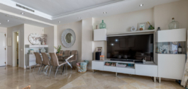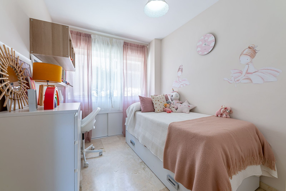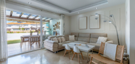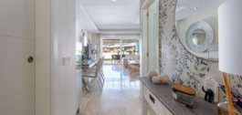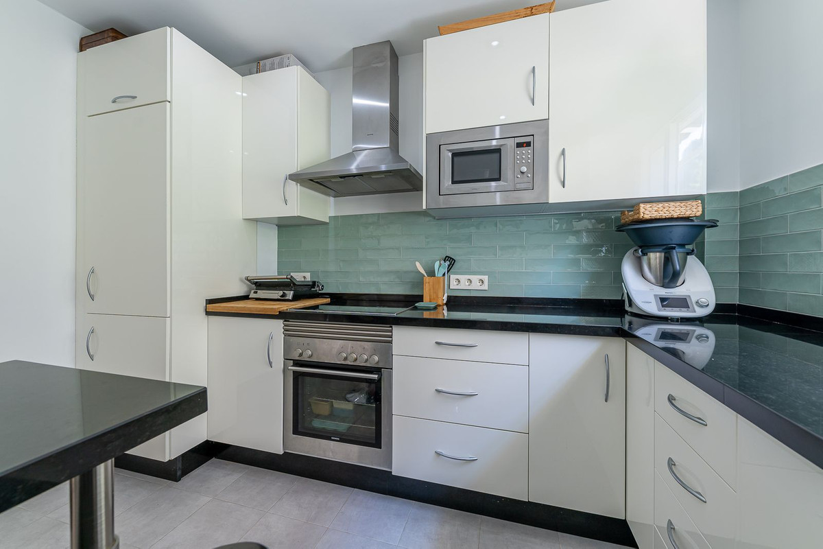 Op de hoofdverdieping vind je een volledig uitgeruste aparte keuken met een aparte wasruimte, en een grote woon-eetkamer met directe toegang tot een terras van 25 m², gedeeltelijk omheind met LUMON-glasgordijnen. Vanaf hier kun je genieten van open uitzicht op groene zones en de gemeenschappelijke zwembaden.