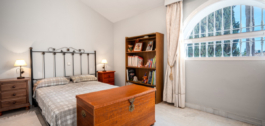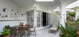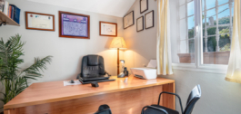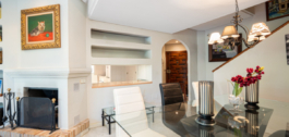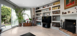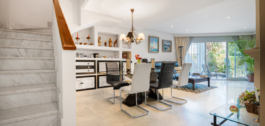 Aan de andere kant van het huis openen de eet- en woonkamer zich, prachtig verlicht door de grote terrasdeuren aan het uiteinde. De eetruimte is verfijnd en elegant en kijkt uit op de woonkamer verderop. Deze is charmant en warm, met een open haard tussen beide ruimtes die warmte biedt in de wintermaanden. De woonkamer biedt directe toegang tot de privétuin en de kans om in alle rust en privacy buiten te dineren. Aan de ene kant van de tuin biedt een poort directe toegang tot het gemeenschappelijke zwembad.