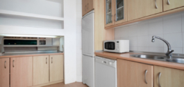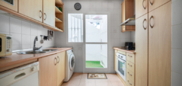 De keuken is licht en helder ingericht in een neutrale havermoutkleur. De keuken is volledig ingericht met bergen kast- en opbergruimte en is volledig uitgerust met alle eersteklas apparatuur en witgoed. Een slim luik opent aan de ene kant en biedt uitzicht op de woonkamer, zodat de chef-kok gasten kan vermaken terwijl hij creëert! Een deur leidt naar een overdekte opslagruimte, compleet met een handige gootsteen, perfect om huishoudelijke spullen uit het zicht te houden.